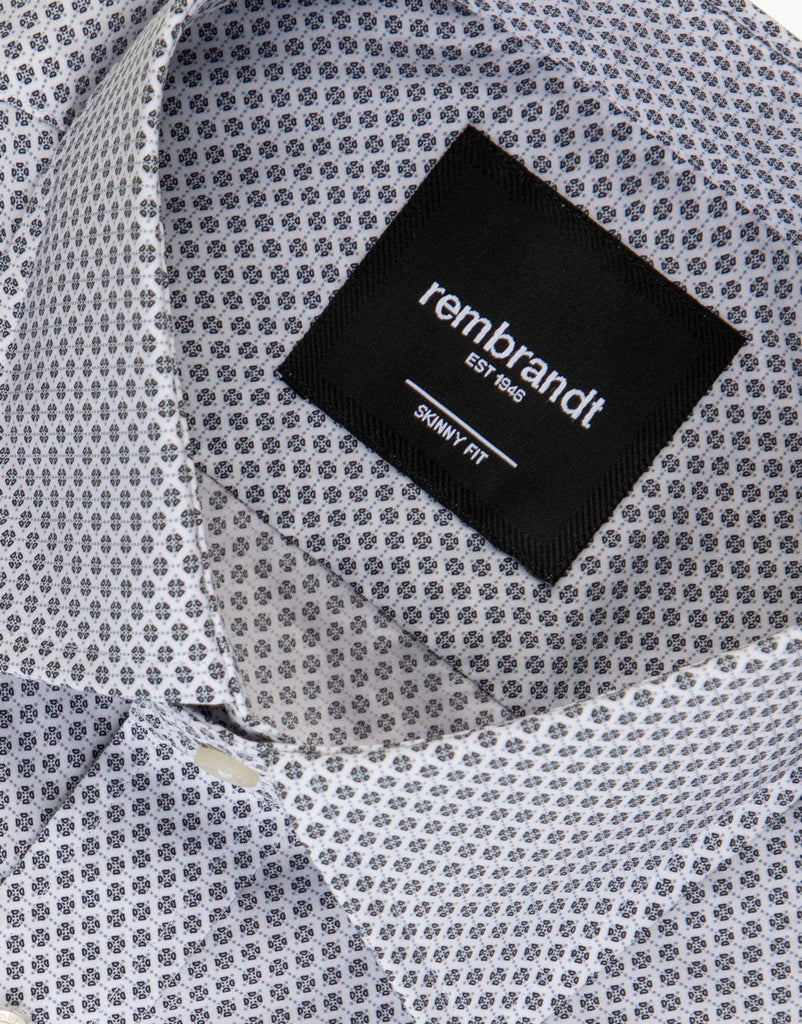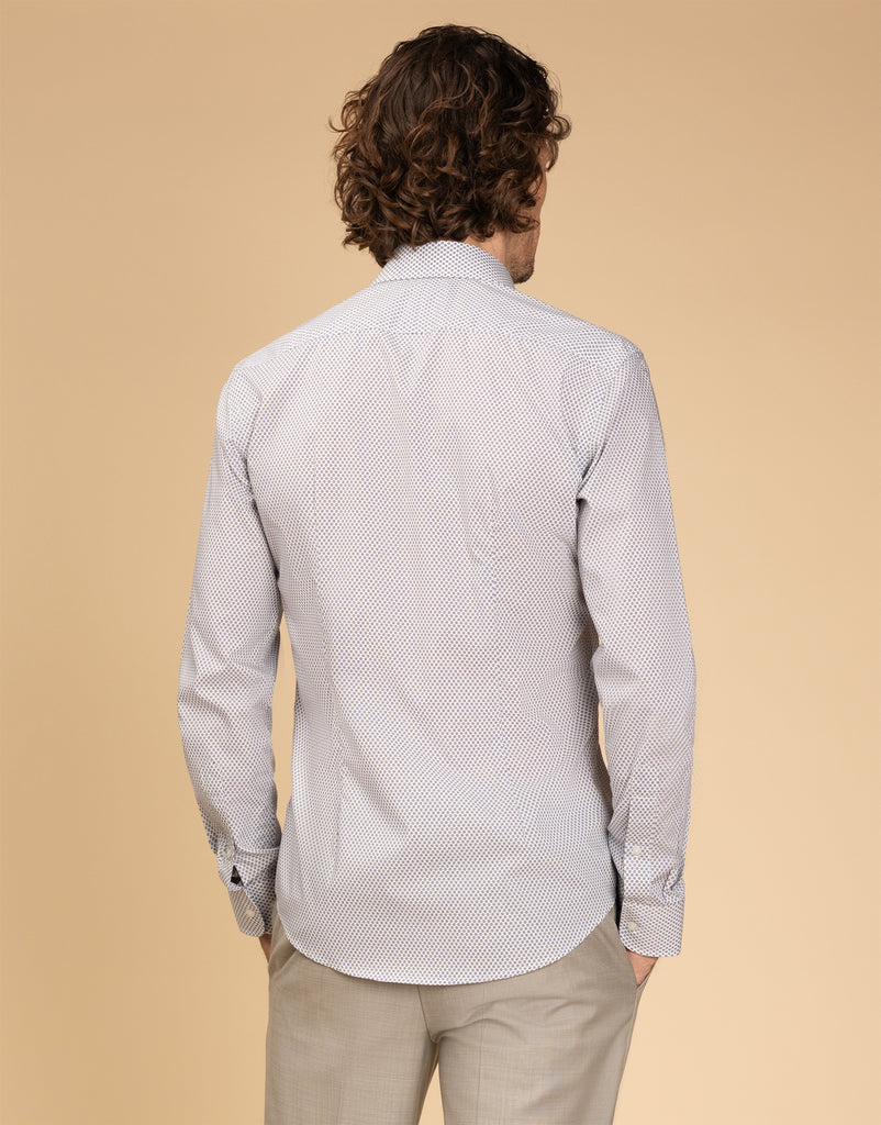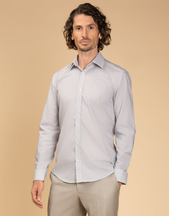 Designed for those who appreciate clean lines and simplicity, the Banks White Micro-design Shirt is a flexible choice for any day of the week. Featuring a subtle light blue diamond pattern, it adds a touch of texture that lifts it above the ordinary. The slim fit contours smoothly through the chest and sleeves, offering a contemporary, tailored look. Made from 100% cotton, it promises comfort and breathability all day long. With smart buttoned cuffs, this shirt effortlessly moves from work to social settings, embodying understated confidence.