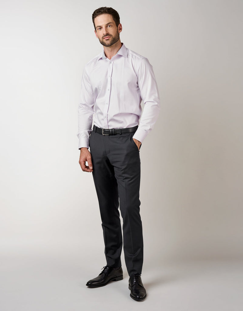 Versatile, comfortable and easy on the eye, this pure cotton lilac shirt will revitalize your officewear with its stylish pastel colour. It is crafted from easy-care cloth that allows for effortless ironing — a premium lightweight fabric that also has moisture-wicking characteristics to provide all-day comfort and freshness. While a tailored slim fit keeps your look sharp, a contrast collar and cuffs bring visual intrigue to the design.