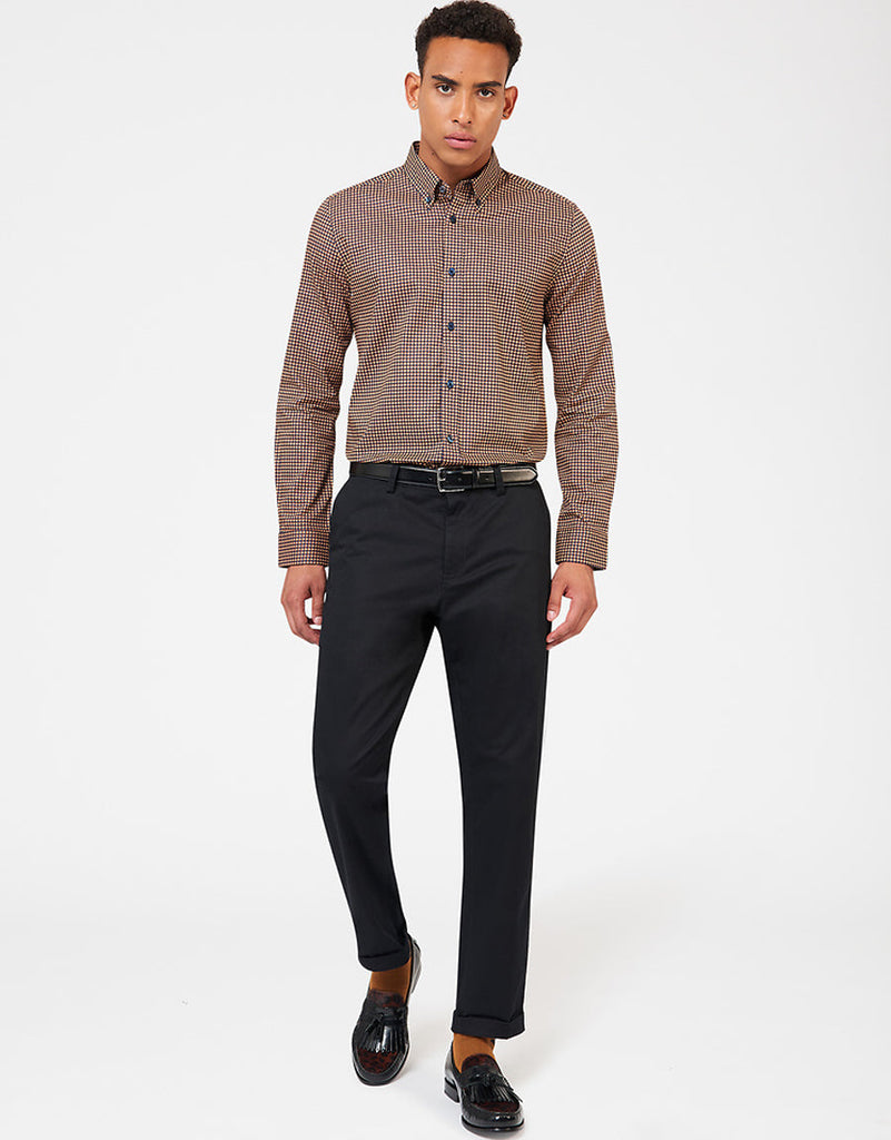 A regular fit shirt designed with a chevron print. Featuring a curved hem, two finger button down collar and a Ben Sherman branded woven tab on the side seam. Made from 100% cotton.