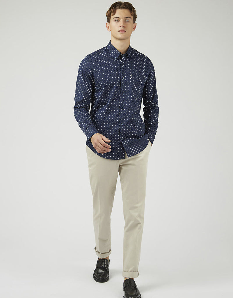 Made from 100% cotton, this long sleeve polka dot print shirt includes a two finger button down collar and a Ben Sherman branded woven tab on the chest pocket. A regular fit featuring a curved hem.