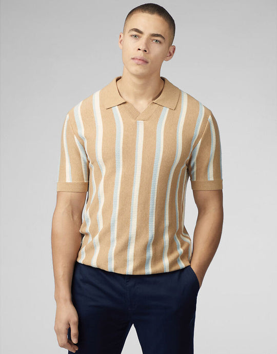 Ben Sherman Vertical Stripe Open Neck Stone Polo