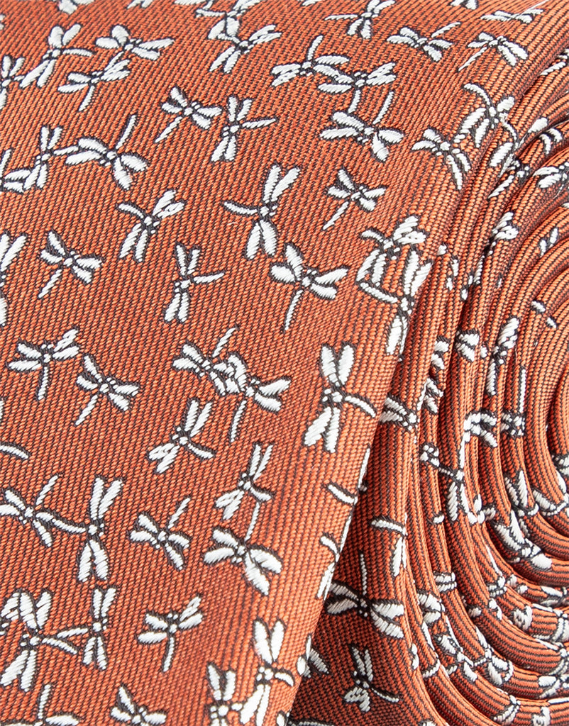 Make a statement with the Burnt Orange & White Dragonfly Silk Tie. This 8cm tie, crafted from pure silk and made in Italy, blends vibrant burnt orange with delicate white dragonfly details for a fresh, confident look. Perfect for adding personality and elegance to any outfit.