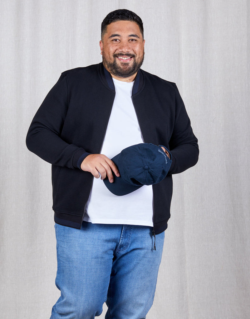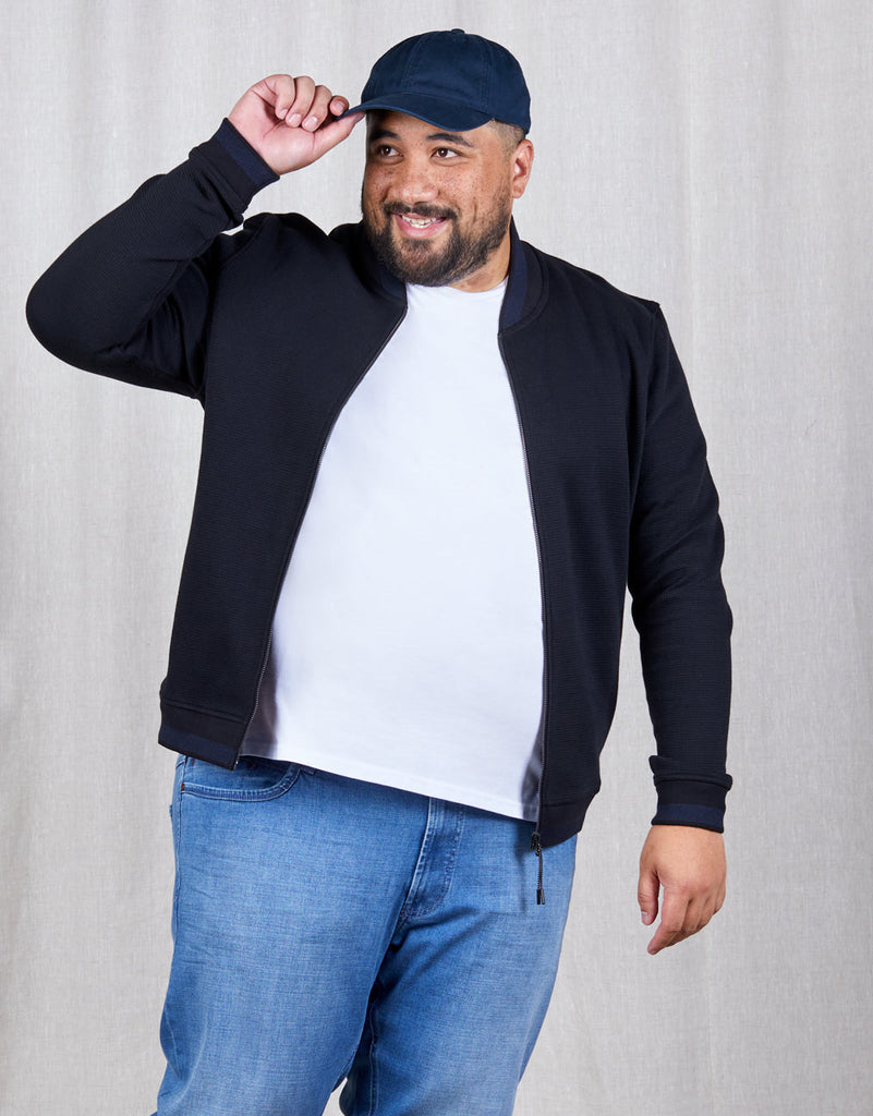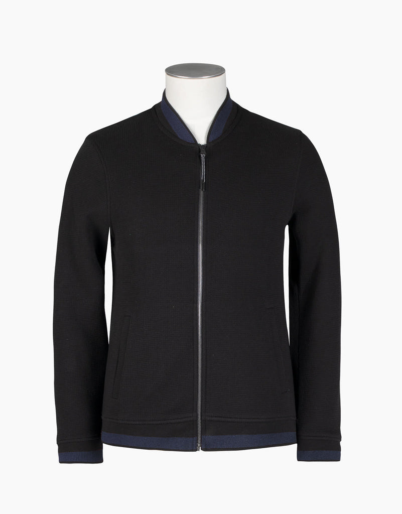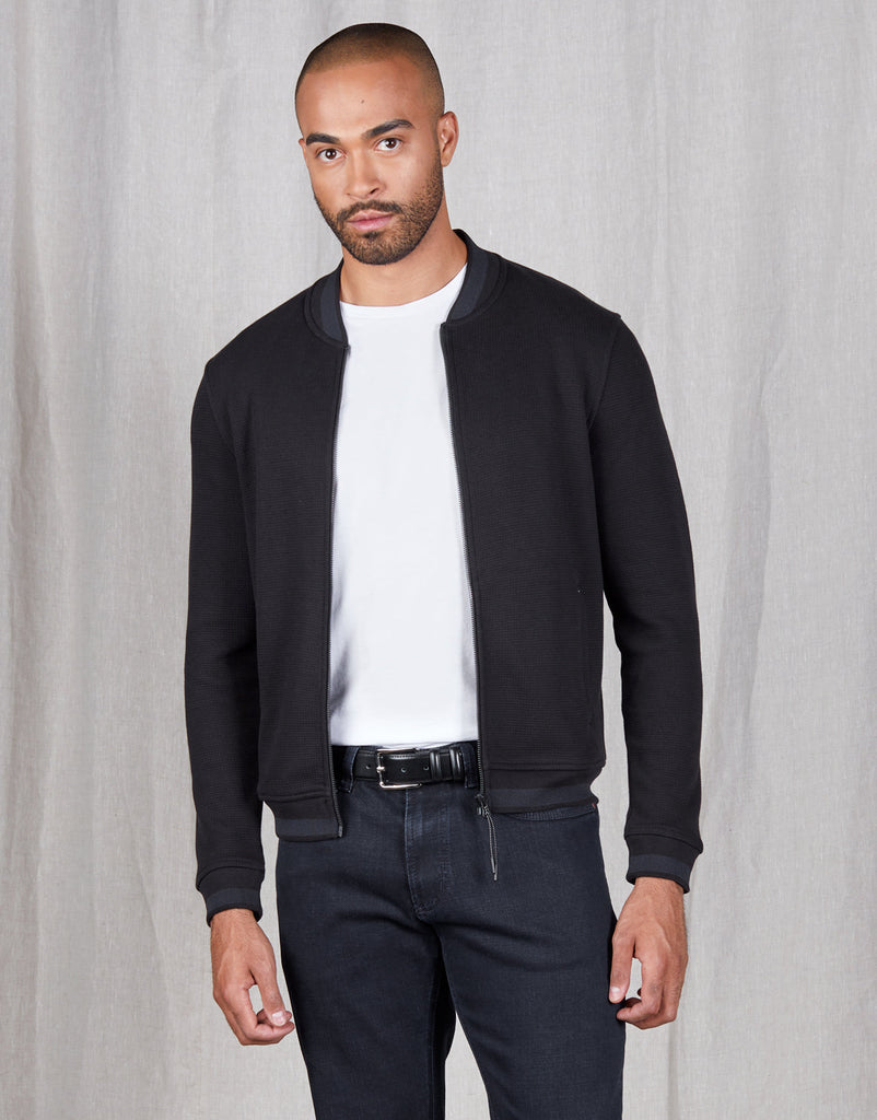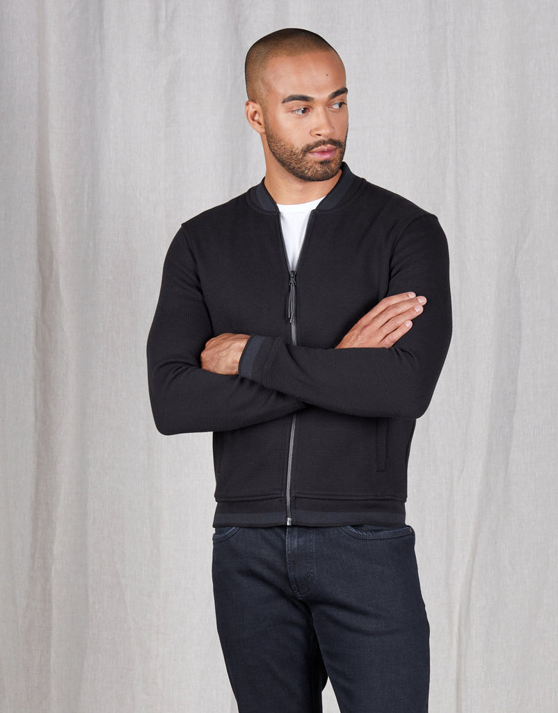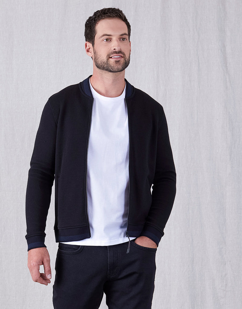Experience the perfect blend of comfort and style with our Domino Black Knit Bomber. This wardrobe essential combines the coziness of a sweatshirt with the sleek design of a classic bomber jacket. Crafted from 100% pure cotton, this breathable fabric provides just the right amount of warmth. The zip-up closure adds a touch of versatility, making it the perfect option for any smart-casual event. Whether paired with jeans for a relaxed look or worn under an overcoat for a more formal occasion, our knitted bomber jacket offers endless styling possibilities.