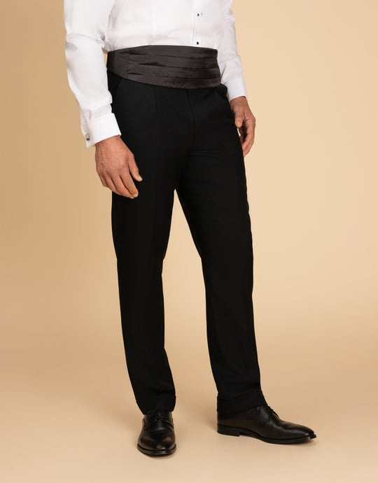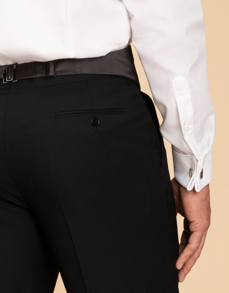 The Evans Jet Black Trouser blends style and comfort effortlessly. Made from pure Super 120’s merino wool, these trousers offer a smooth, refined finish with excellent breathability. Perfect for upgrading your wardrobe, they add a sharp and confident look to any outfit, whether for the office or special occasions. Featuring a single pleat, elastic side adjusters, and a cuffed hem, they pair seamlessly with a matching jacket and waistcoat, tailored to suit you perfectly.