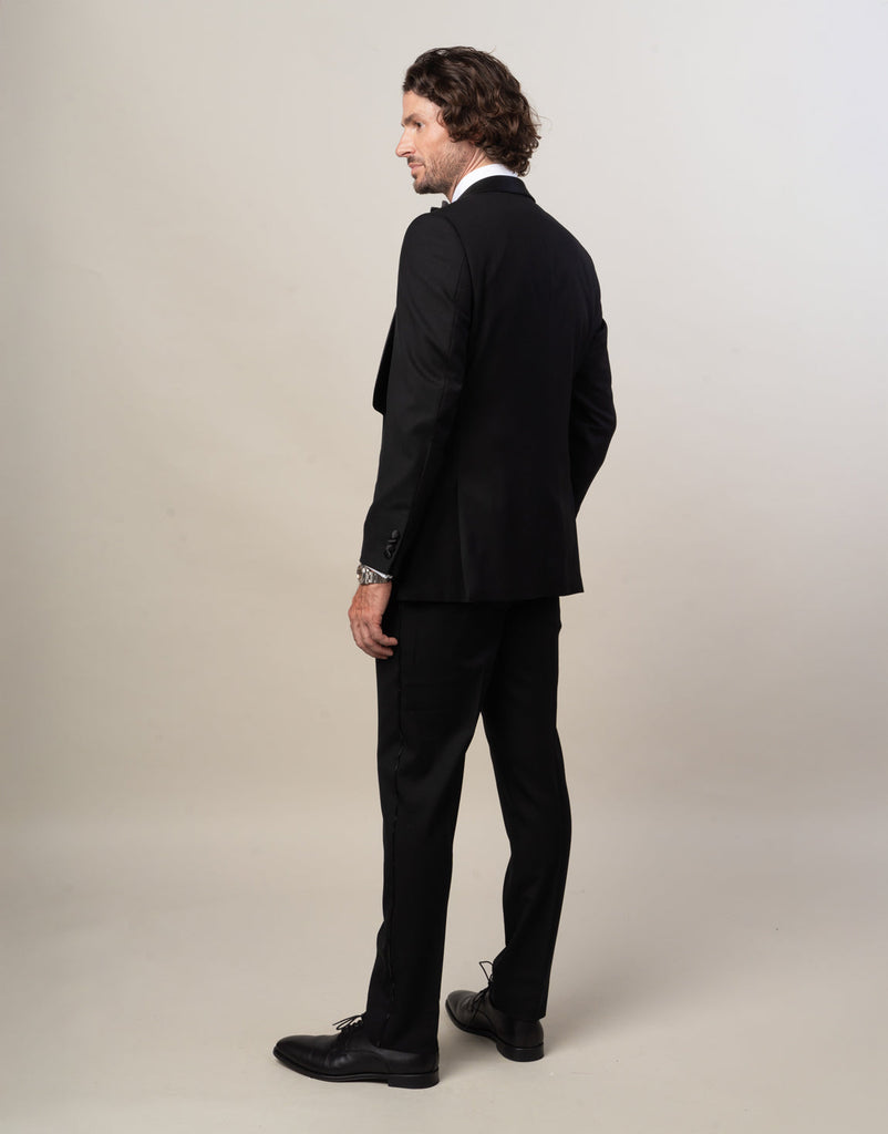 A tuxedo is only as good as its foundation, and the Ferry Jet Black Tuxedo Suit Trouser sets the bar high. Crafted from fine Super 120’s wool, these trousers offer a lightweight, breathable feel with a sleek finish. The side adjusters provide a customisable fit, while the expertly tailored cut ensures a refined silhouette. Pair with the Trace Black Tuxedo Jacket for a traditional black-tie look or opt for the Bryan Shawl Collar Jacket for contemporary flair.