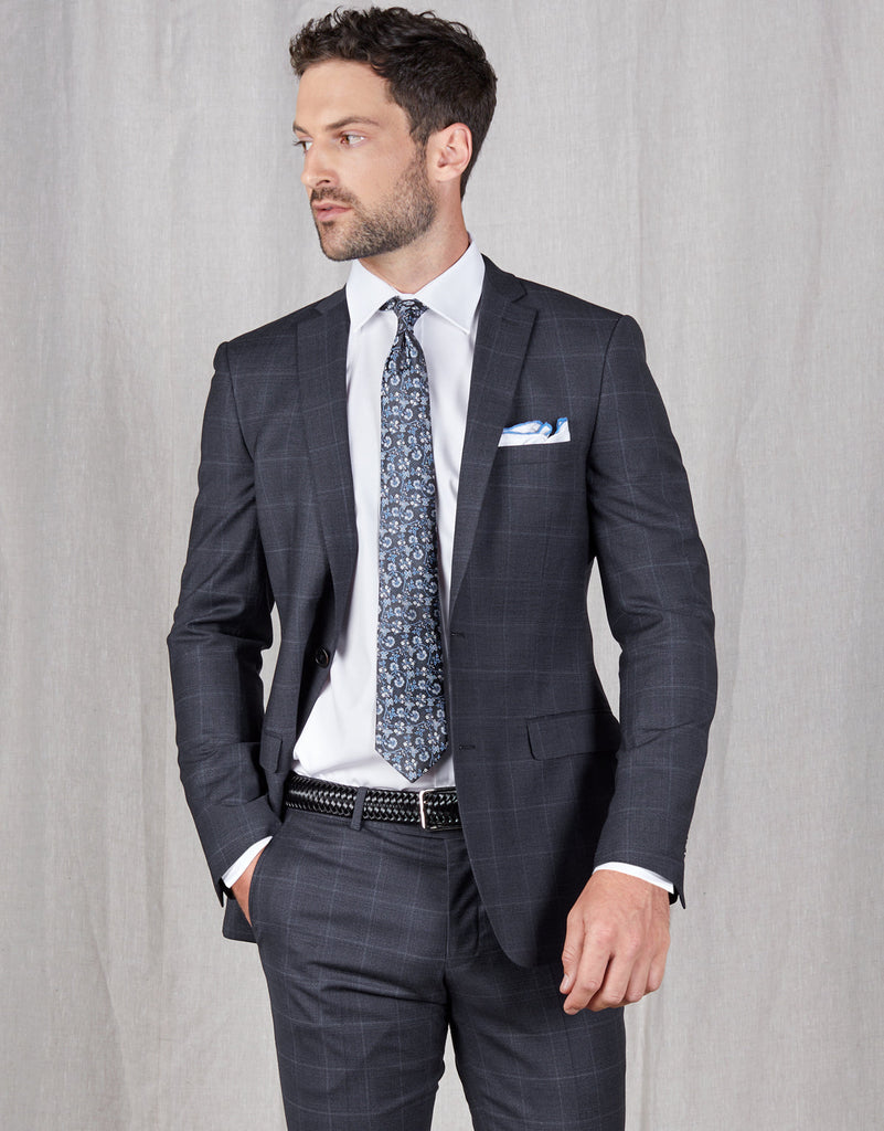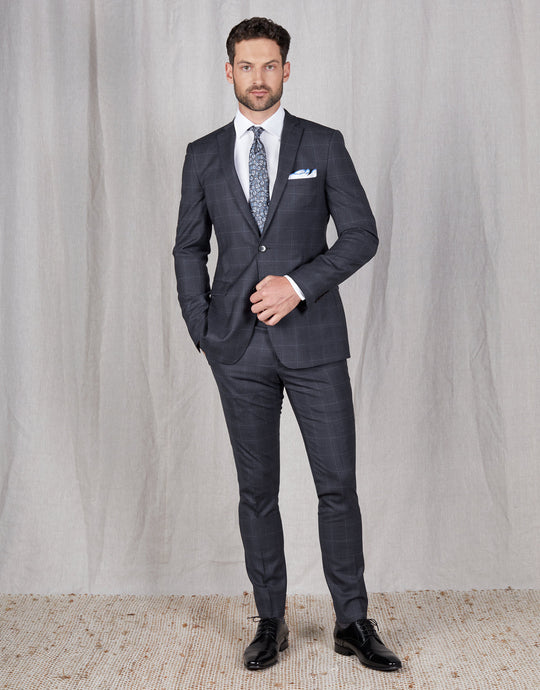 Look sharp in the Fresh Navy Check Two Piece Suit. Crafted from a wool-blend fabric with stretch, the suit's slim-fit cut is designed to fit close to the body for a sleek, stylish look without compromising comfort. Show off your individual style with this modern classic.
