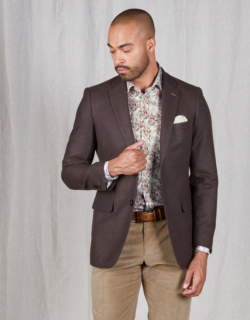 Hawker is our most popular style of blazer. Crafted from a premium blend of recycled wool, polyester and a hint of polyamide for added comfort with a pleasing tactile finish, it is tailored with a shorter cut than a suit jacket making it easy to dress up or down with chinos or jeans or dress pants. Shades of maroon and navy yarns are woven together to make the herringbone blazer.