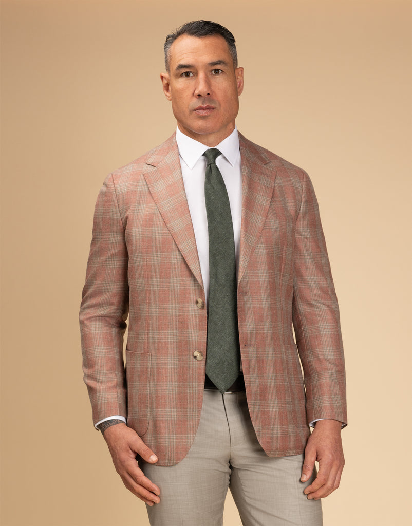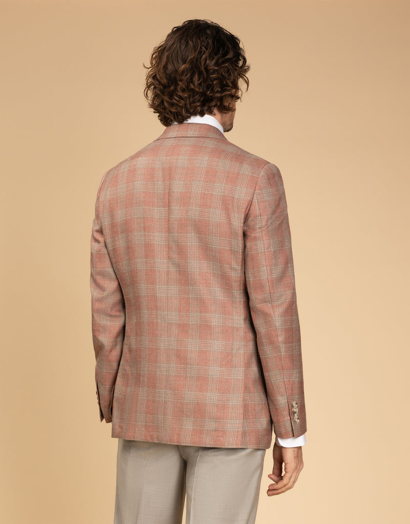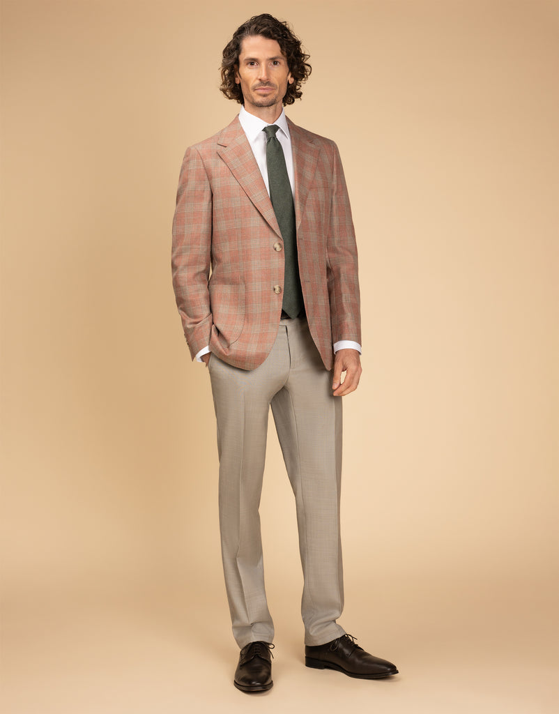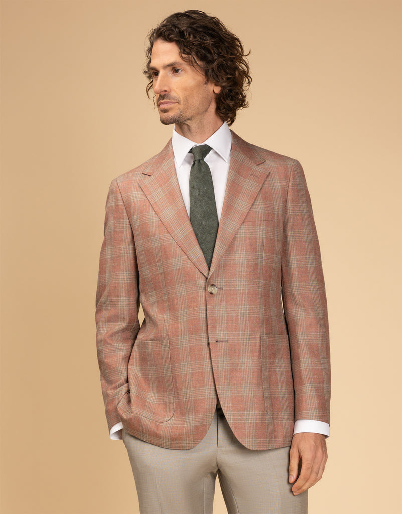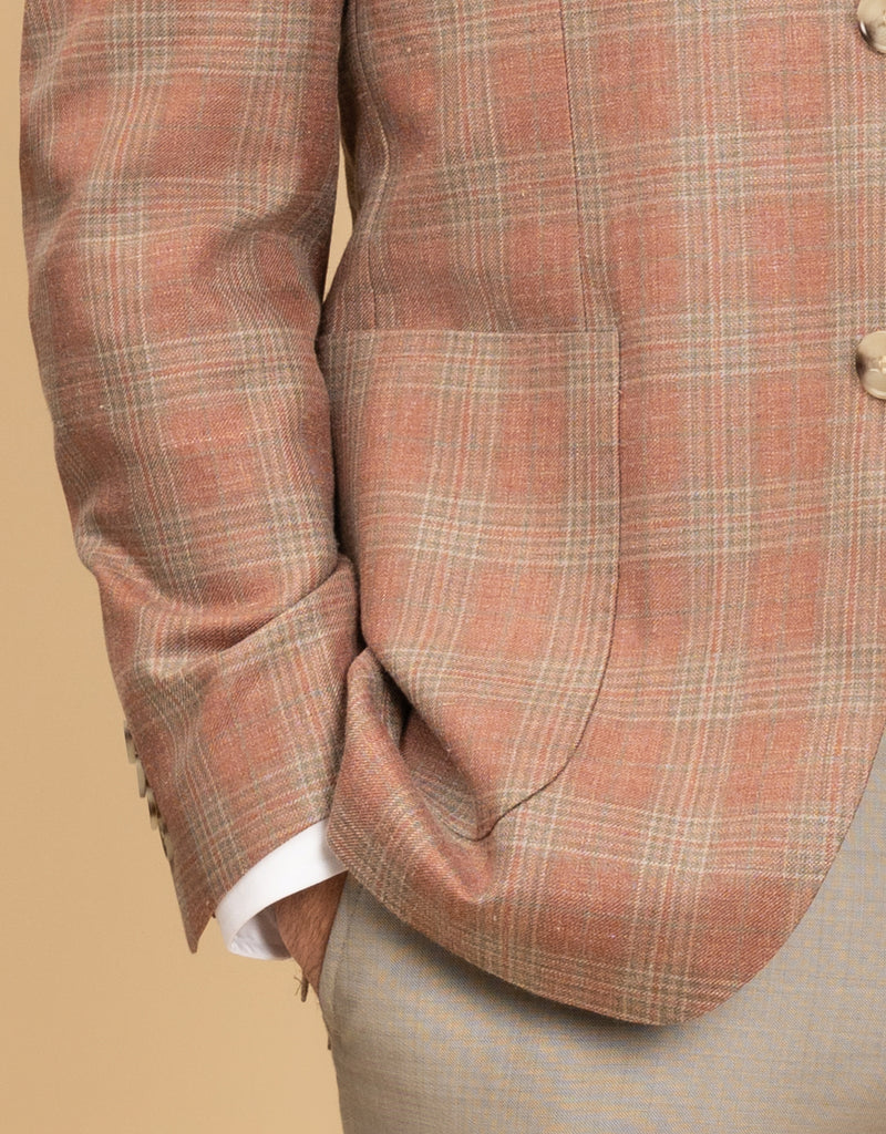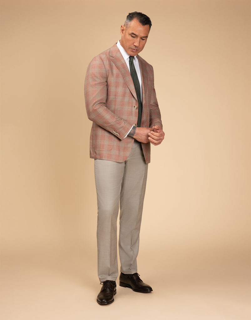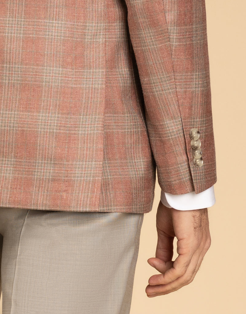 The Malta Pink & Sage Glen Check Blazer is a stylish choice for summer events, crafted from a breathable blend of wool, silk, and linen. Its soft construction and half-lined design ensure comfort, while the two-button front, side vents, and patch pockets add classic detailing. With subtle pic-stitching, this blazer offers a polished yet relaxed look that’s perfect for warm-weather occasions.
