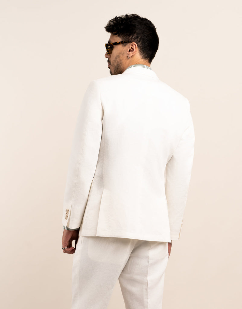 Elevate your wardrobe with the Malta White Linen Blend Blazer. Crafted from luxurious Italian linen-cotton, this blazer exudes timeless elegance and comfort. The crisp white fabric is a bold choice that will turn heads wherever you go. For a complete outfit, pair it with the Evans trousers to create a stunning suit.