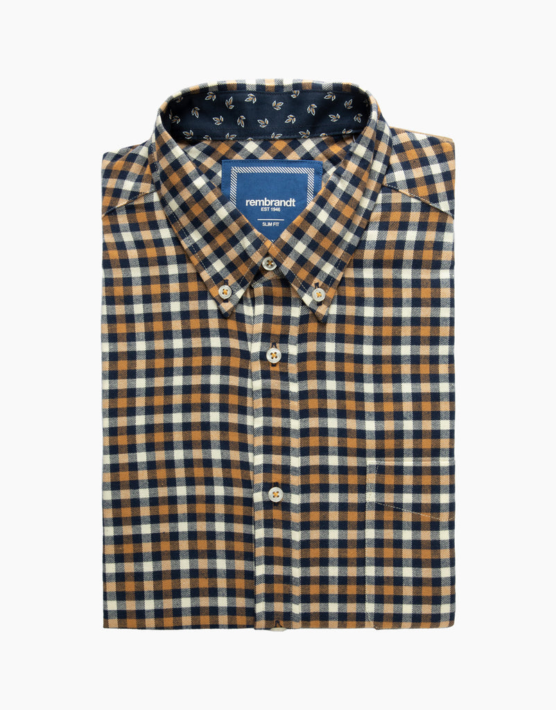This slim-fit blue & camel check flannel shirt is crafted from 100% brushed cotton for superior softness and warmth. It features a front pocket and button-down collar, making it easy to combine with jeans, chinos, or trousers to complete your smart-casual look.