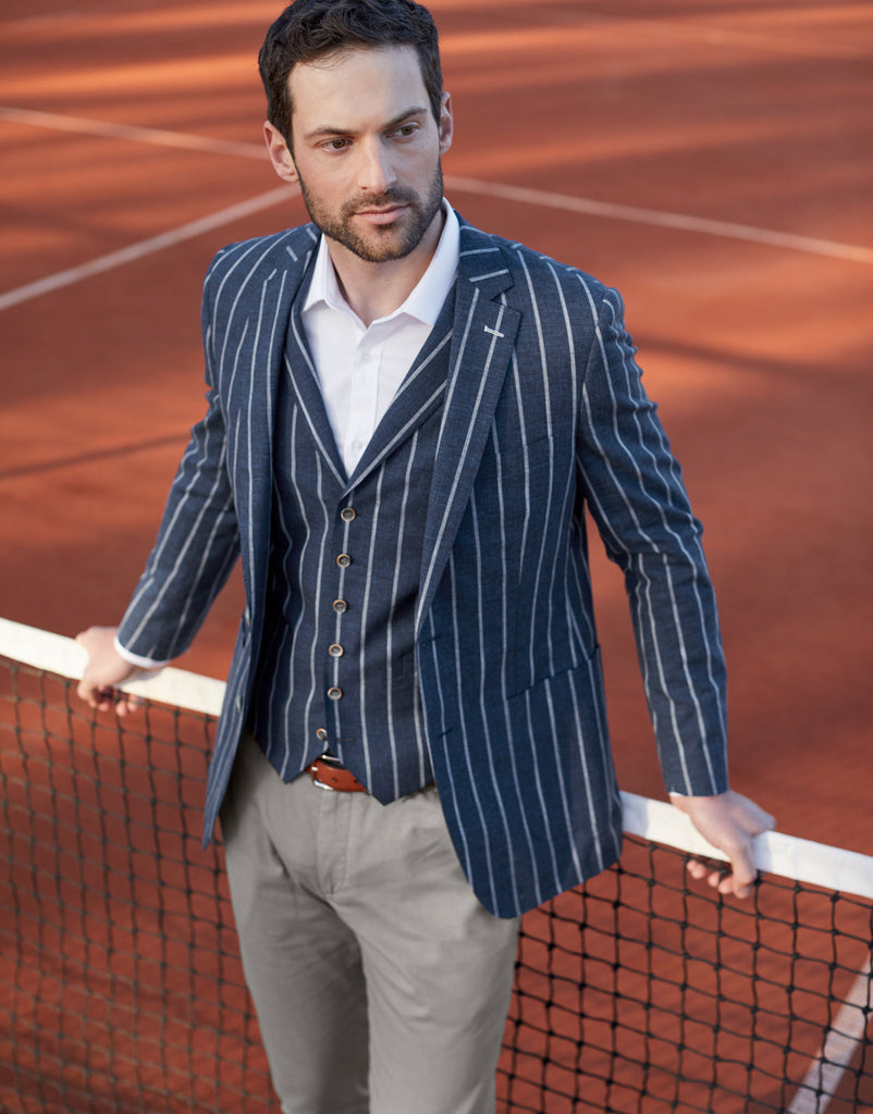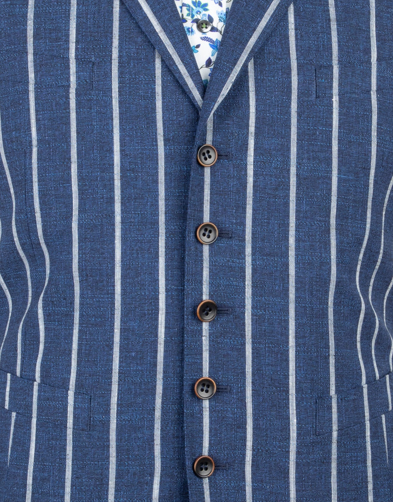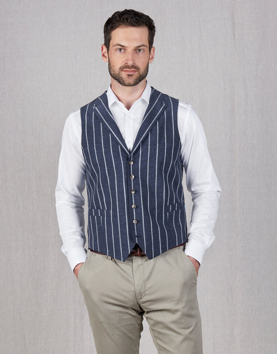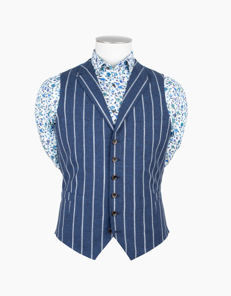 Crafted from a premium blend of wool, cotton, linen and a hint of elastane for added comfort with a pleasing tactile finish, it is tailored with a front lapel suited for any smart-casual attire. Our blue stripe Shelby waistcoat can be worn three ways: with a matching blazer, under a contrasting blazer, or over a shirt. The choice is yours.