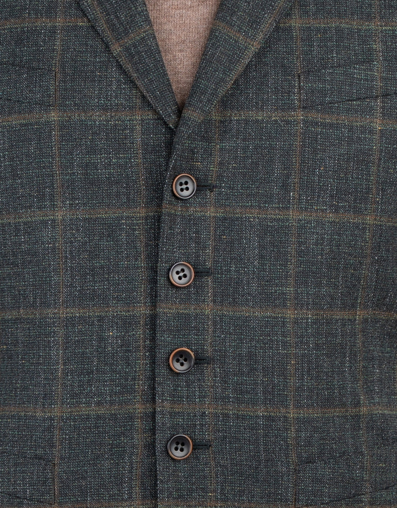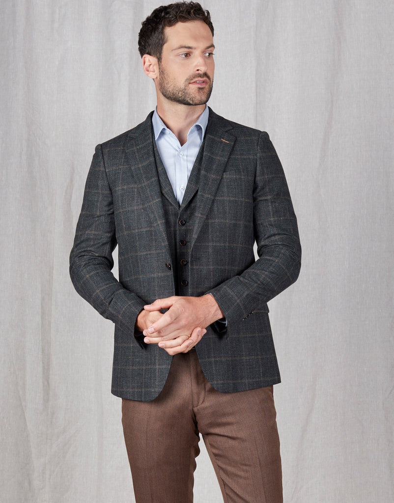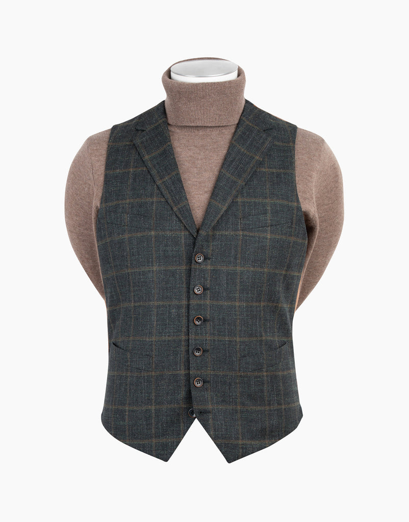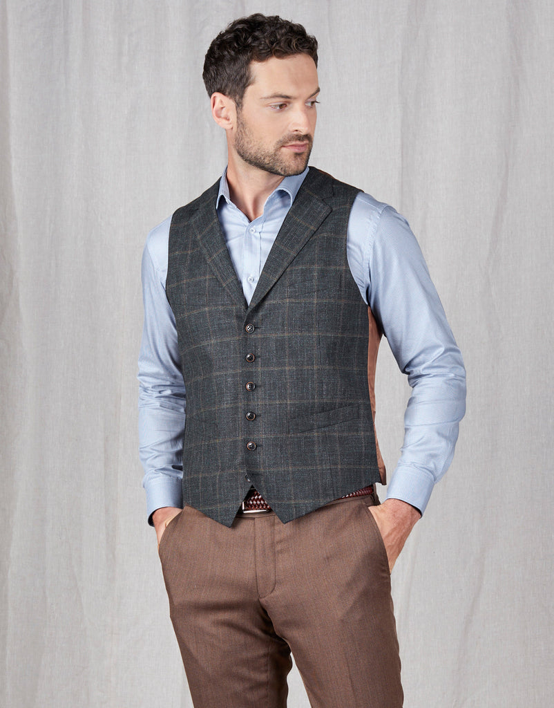 Crafted from a premium blend of wool, cotton, linen and a hint of elastane for added comfort with a pleasing tactile finish, it is tailored with a front lapel suited for any smart-casual attire. Our green and brown check Shelby waistcoat can be worn three ways: with a matching blazer, under a contrasting blazer, or over a shirt. The choice is yours.