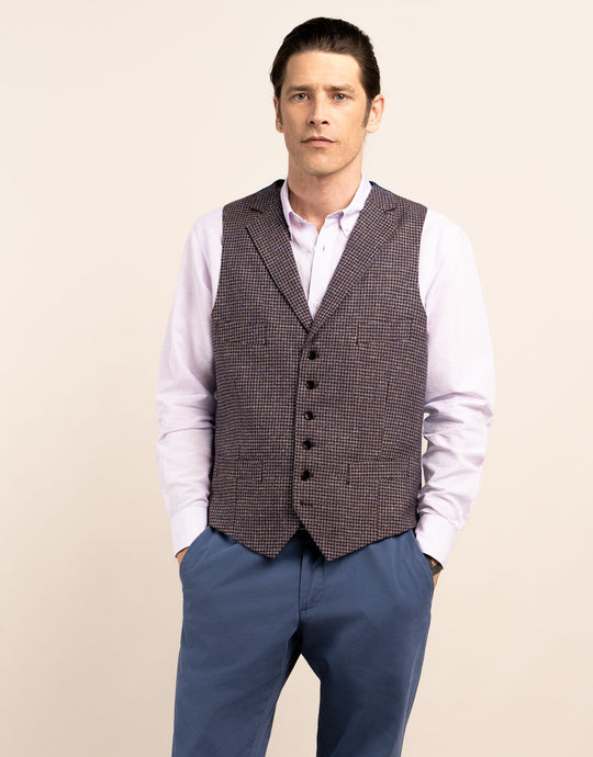 Made with a mix of wool, polyester, and linen and finished with a tactile touch, our Shelby waistcoat in maroon and blue guncheck offers versatility. Wear it with a matching blazer, layered under a contrasting blazer, or over a shirt - the choice is yours.