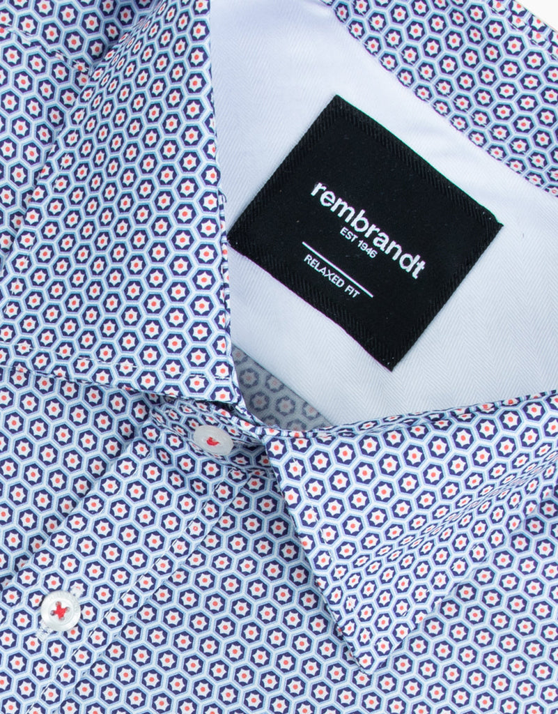 The Sinatra Blue & Red Hexagon Shirt is crafted with a blend of cotton and elastane for a comfortable fit, perfect for the modern professional. Its timeless design showcases an effortless blue & red hexagon pattern, complemented by a convenient chest pocket and back pleats for enhanced movement.
