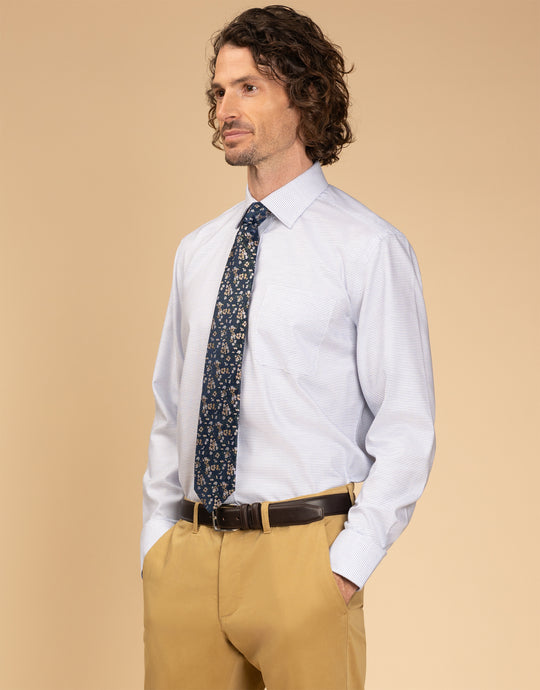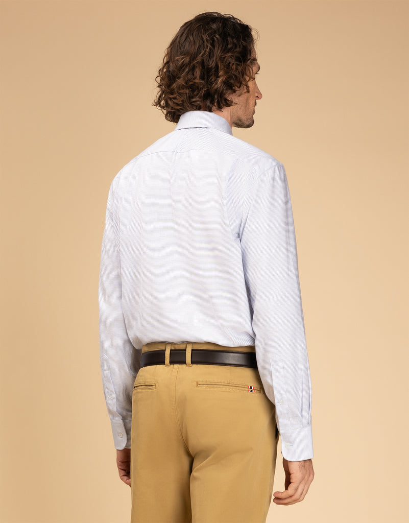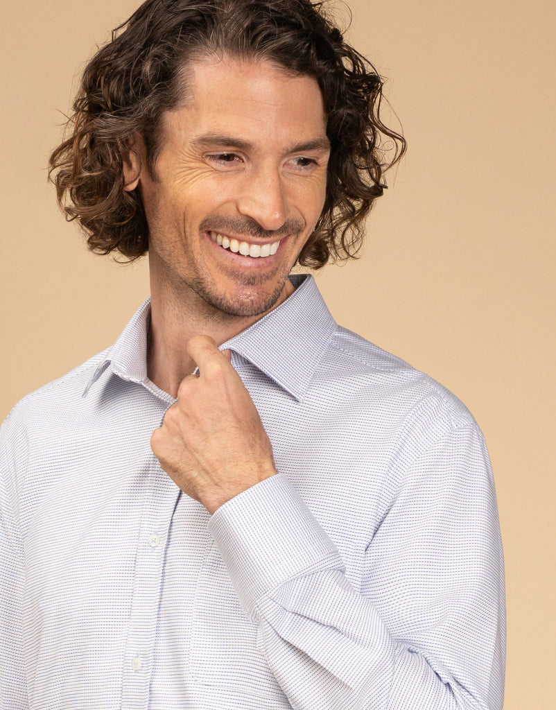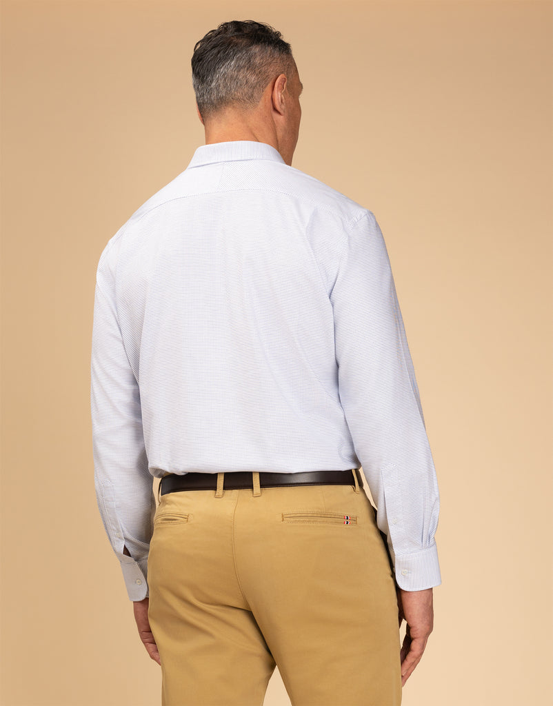 The Sinatra White & Blue Micro-design Shirt combines comfort and sophistication. Constructed from a soft cotton blend with a slight stretch from elastane, it offers a relaxed fit that adapts seamlessly to your movements. The refined white and blue micro-pattern introduces a subtle yet distinctive character, making it suitable for both casual and smart-casual attire. This shirt is designed to provide lasting comfort while ensuring a polished and confident appearance.