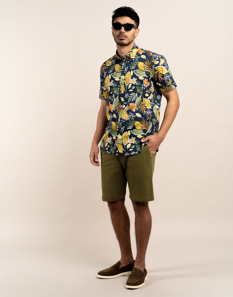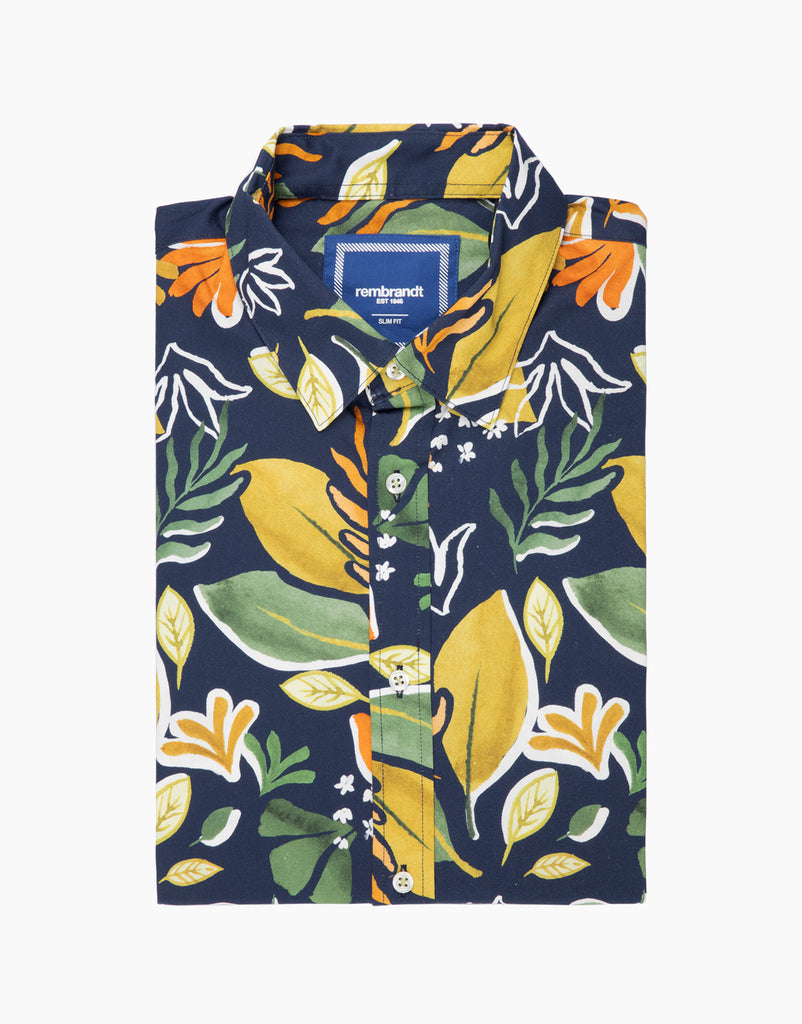 Waihi Navy Large Painted Leaf Print Short Sleeve Shirt