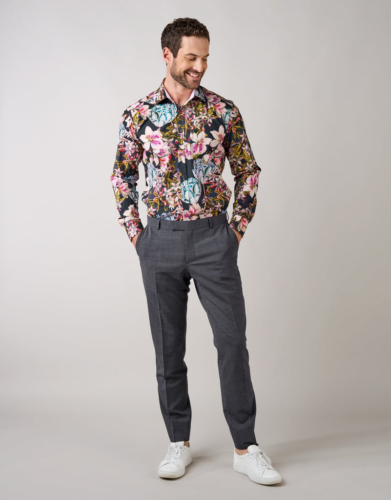 Our most popular fit. A contemporary cut that is slightly wider across the Jacket chest and abdomen and wider in the Trouser leg than the Narrow fit. It creates a flattering silhouette on men of all shapes and sizes.