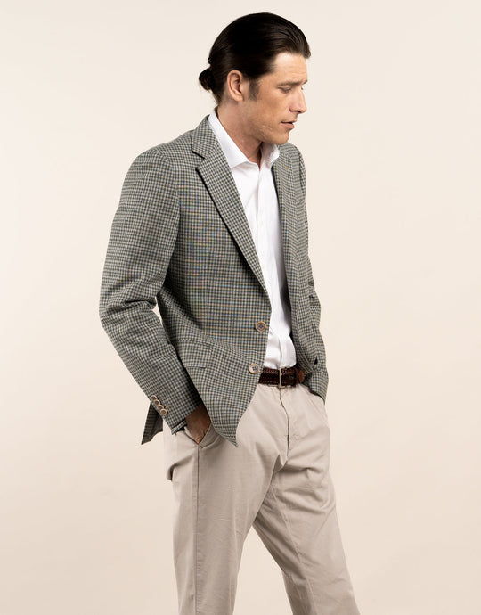 Crafted from a premium blend of wool, cotton, line and a touch of elastane for added comfort. It is tailored with a shorter cut than a suit jacket making it easy to dress up or down with chinos or jeans or dress pants. Shades of green yarns are woven together to make the gun check pattern.